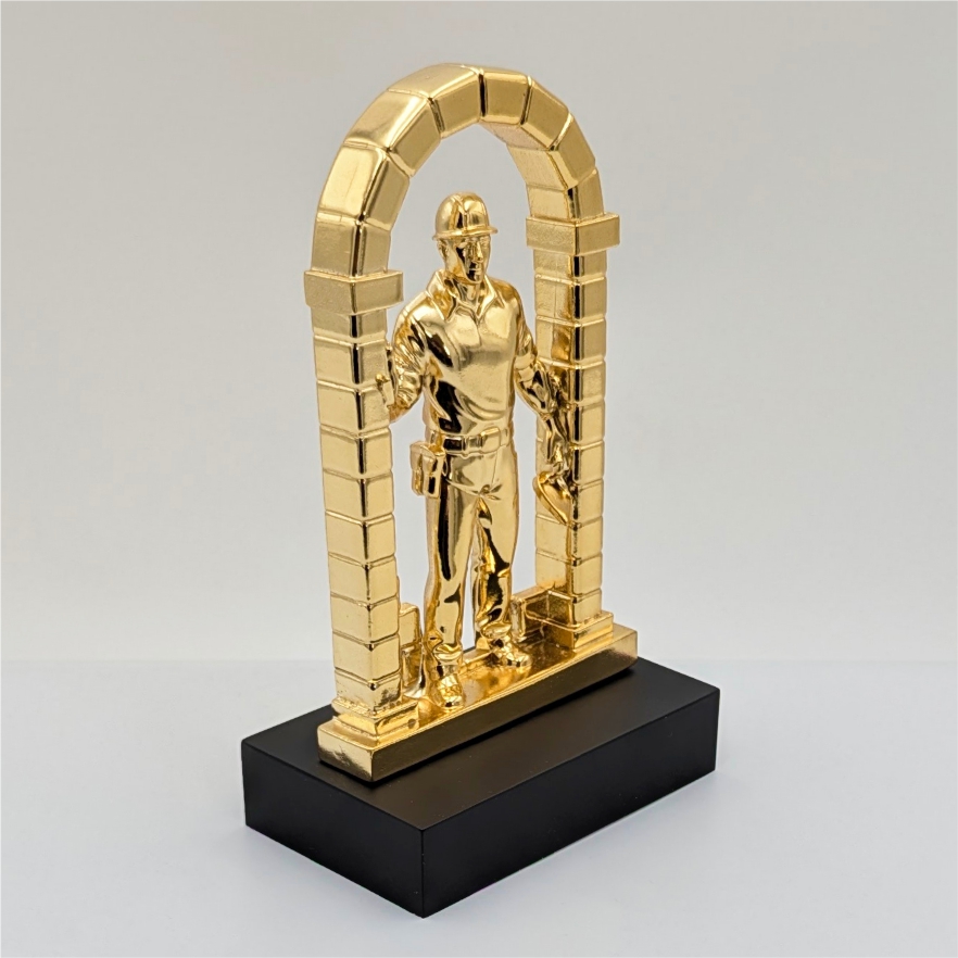 Статуэтка мастер своего дела — это символ профессионализма, опыта и уважения к труду специалиста. На фото представлена золотая фигура мастера, стоящего под аркой из кирпичной кладки. В руках мастер держит строительный инструмент, а рядом изображены элементы строительной площадки. Такая композиция подчеркивает мастерство, опыт и вклад специалиста в создание надежных объектов. Статуэтка мастер профессии выполнена в строгом и презентабельном стиле, благодаря чему она отлично смотрится в кабинете, офисе или на рабочем столе.