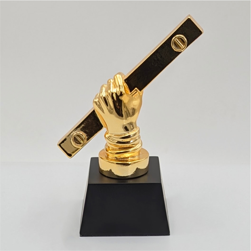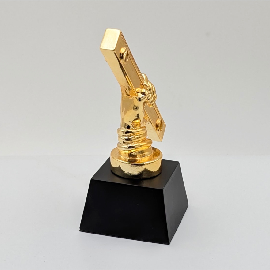 Каждая статуэтка строительный уровень проходит несколько этапов производства. Сначала подставка из МДФ тщательно шлифуется и закрашивается в черный матовый цвет, создавая аккуратную основу. По желанию можно заказать именную табличку. Табличка металлическая золотая, нанесение выполняется методом сублимационной печати, при этом табличка в стоимость статуэтки не входит. Далее выполняется изготовление пресс-формы, обеспечивающей точную передачу деталей. Затем выполняется литьё пластиковой фигуры с высокой степенью детализации, что позволяет точно передать форму руки и строительного уровня. После этого наносится прочное гальваническое покрытие золотого цвета, придающее изделию премиальный внешний вид и долговечность. Завершающим этапом является упаковка изделия. Такой сувенир строительный уровень Казахстан идеально подходит для награждения сотрудников строительных организаций и партнеров компании.