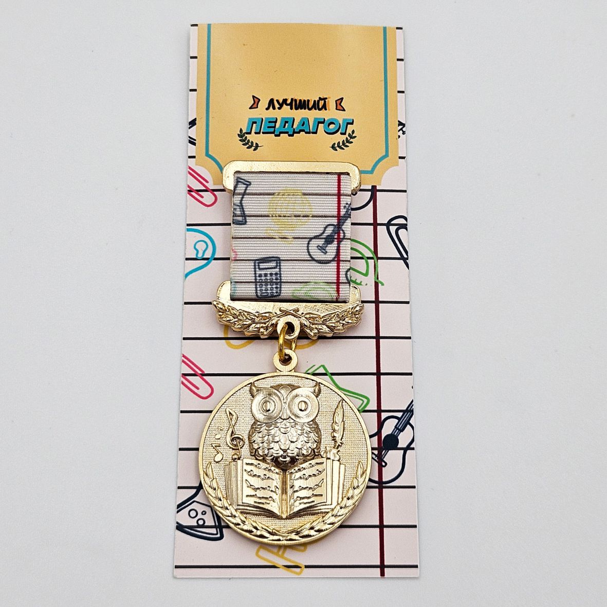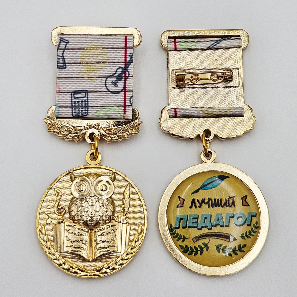 🌿 Символ мудрости и вдохновения. Медаль «Лучший педагог» создана как искренний подарок человеку, который ежедневно вкладывает душу в обучение и воспитание. На лицевой стороне изображена мудрая сова — символ знаний, открытая книга и перо, олицетворяющие труд и творчество учителя. Эти элементы объединены в гармоничную композицию, подчеркивающую высокий статус педагога. Муаровая лента с тематическим узором — глобусом, калькулятором и нотами — завершает образ и придаёт медали характер праздничной награды.